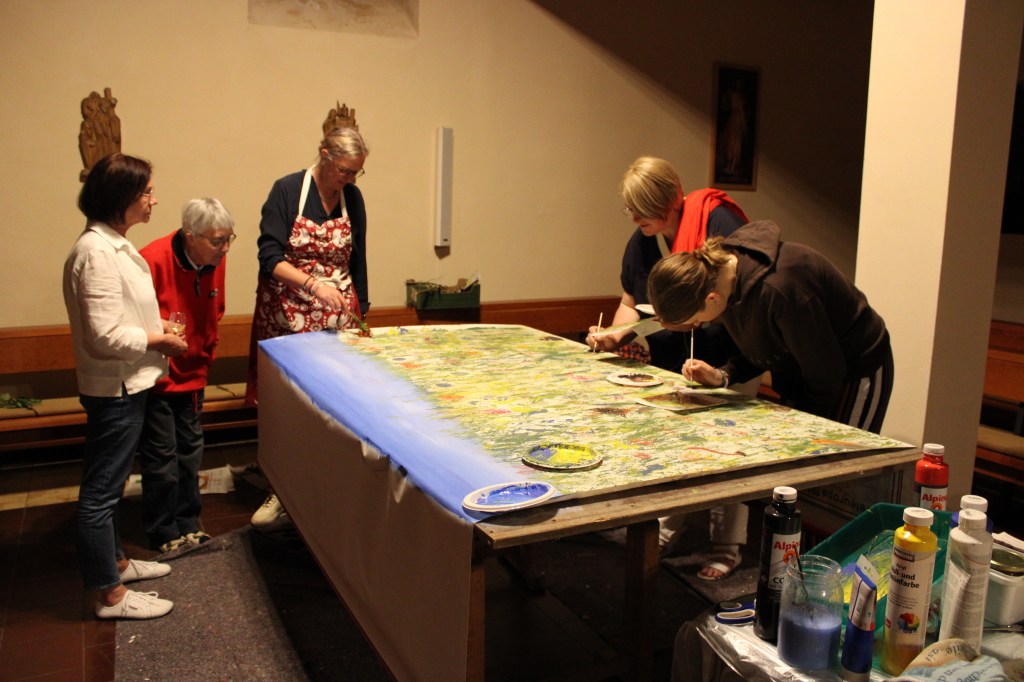Ortswechsel: Eine ganz andere Stimmung empfängt zu vorgerückter Stunde die noch etwa 40 Gäste in der Kirche St. Johannes in Noswendel, der „Kirche der Nachhaltigkeit“. Entspannend ist es hier, fast meditativ. Bei dezenter Musik werden Naturaufnahmen aus Noswendel gezeigt. Mehrere Frauen gestalten ein großformatiges Kunstwerk mit, malen Kleintiere und Insekten auf eine Blumenwiese. Im Foyer genießen andere Brot, Käse und Wein. „Wunderbar“, findet Tanja Buchheit-Thewes vom Leitungsteam des Pastoralen Raums Wadern die Atmosphäre.