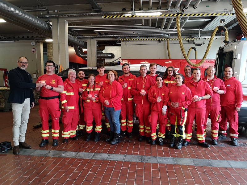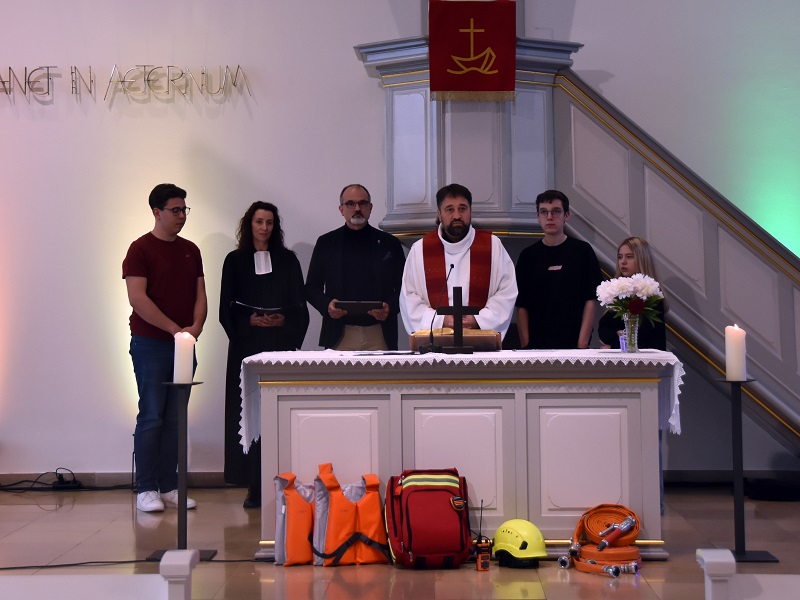 Die teils dramatische Hochwasserlage im Saarland machte für manche Verantwortliche ein kurzfristiges Umplanen nötig: Zwei Gemeinden, die mitfeiern wollten, sagten die Teilnahme ab, weil ihre Gemeindehäuser unter Wasser stehen, Zufahrten überschwemmt und an vielen Orten Aufräumarbeiten im Gange waren, andere mussten teilweise ihr Programm verändern. Fast alle griffen die aktuelle Lage in ihrem Programm auf, in dem sie etwa für von Hochwasser Betroffene und die Rettungskräfte beteten und Spenden sammelten. Auch der geplante Eröffnungsgottesdienst in der Hugenottenkirche in Ludweiler, bei dem Jugendliche eine extra für diesen Abend geschriebene Inszenierung aufführen wollten, wurde kurzerhand zu einem Solidaritätsgottesdienst umgestaltet: „In einer solchen Situation haben wir andere Prioritäten gesetzt: Wir wollen mit dem heutigen Gottesdienst beten, solidarisch sein und mit den Sorgen und Nöten nicht alleine zu sein“, sagte Diakonin Annette Vollmer (Evangelische Kirchengemeinde Völklingen-Warndt), die gemeinsam mit Kaplan Dr. Michael Meyer (Katholische Kirche Völklingen) den Gottesdienst leitete. Rettungsweste, Feuerwehrschlauch, Helm und Sanitätsrucksack standen vor dem Altar symbolisch für den tatkräftigen Einsatz der zahlreichen Rettungskräfte. Auch die Liedauswahl („Bewahre uns Gott, behüte uns Gott“, „Von guten Mächten“, „Sei behütet auf deinen Wegen“) drückte die Bitte um Trost und Beistand aus für alle Betroffenen aus. In den Fürbitten brachten die Jugendlichen der Gemeinde die Bitte um tatkräftigte Hilfe durch die Verantwortlichen und den Dank an die Blaulichtfamilie zum Ausdruck: „Sie sind Vorbilder in unserer Gesellschaft und verdienen Respekt. Für sie und ihren unermüdlichen Einsatz beten wir.“ Für eine stimmungsvolle musikalische Umrahmung des Solidaritätsgottesdienstes sorgten Nick Henkel und Markus Waldura an der Orgel sowie Anette König-Clasen (Gitarre und Saxophon). Stellvertretend für die Partner der Ökumene überbrachte Superintendent Markus Karsch vom Evangelischen Kirchenkreis Saar-Ost im Anschluss an den Solidaritätsgottesdienst den Einsatzkräften von THW, Berufsfeuerwehr, DLRG und Maltesern an der Saarbrücker Feuerwache das Pfingstlicht.